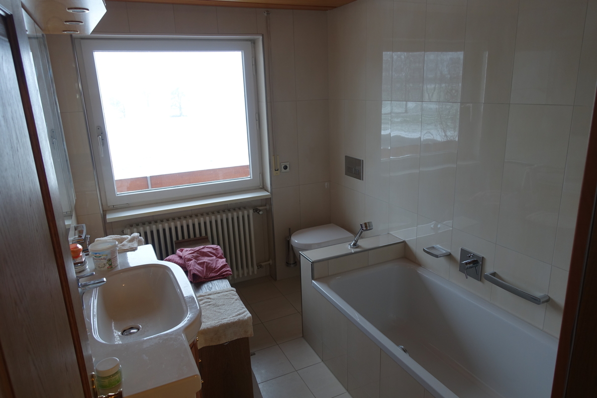 - Tageslichtbadezimmer mit Badewanne und Duschaufsatz, WC, Doppelwaschbecken