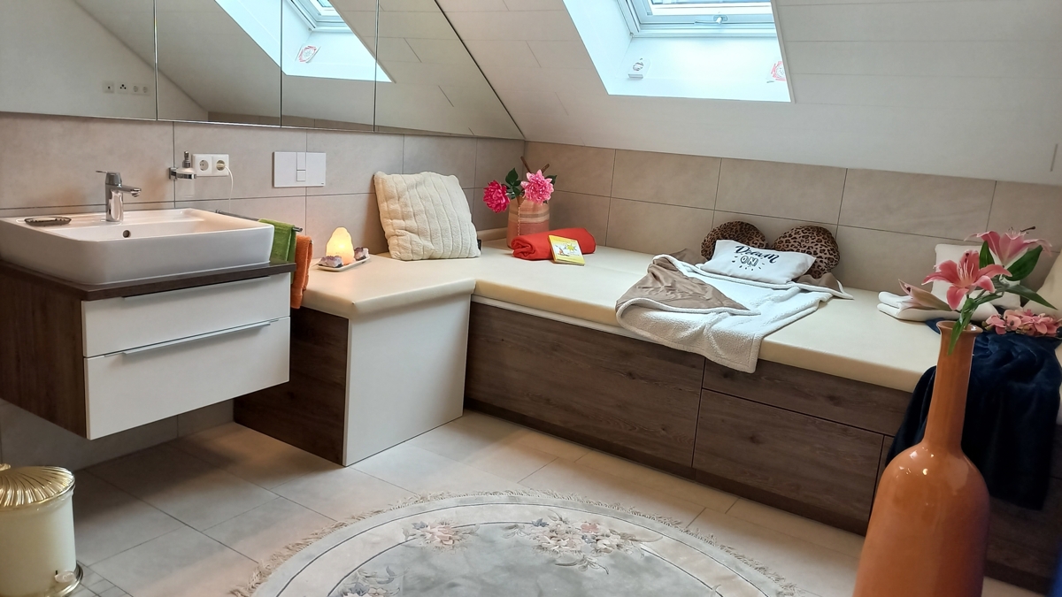 - Im Gäste-WC in die Wand eingebaute Schränke, zusätzlich Spiegelschränke im Bad,