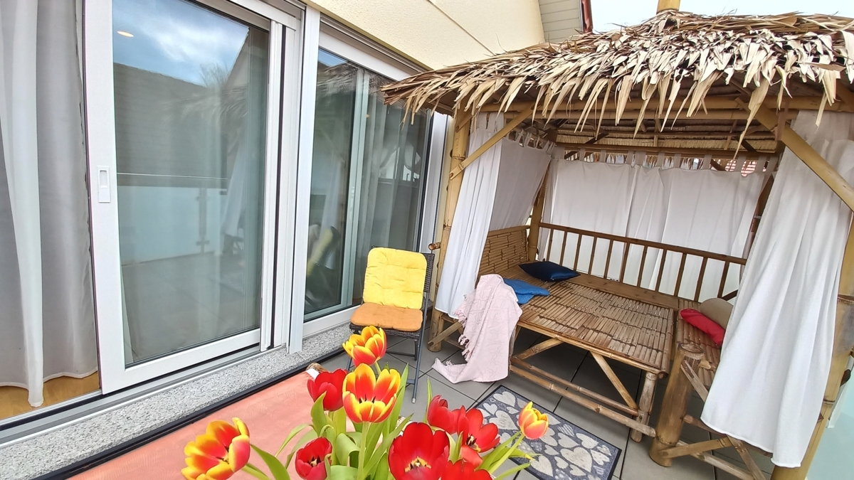 - Gedeckter Bambus-Pavillion auf dem Südbalkon, vielseitig nutzbar z.B zum