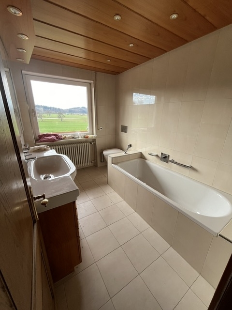 - Tageslichtbadezimmer mit Badewanne und Duschaufsatz, WC, Doppelwaschbecken