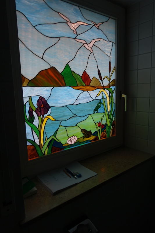 - das Badezimmer hat ein aufwendig gestaltets Bleiglasfenster