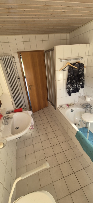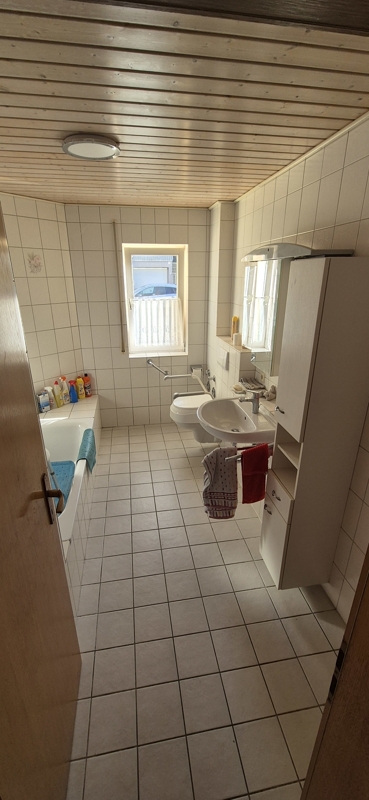 - Tageslichtbadezimmer mit Badewanne, Duschkabine, Waschbecken und WC