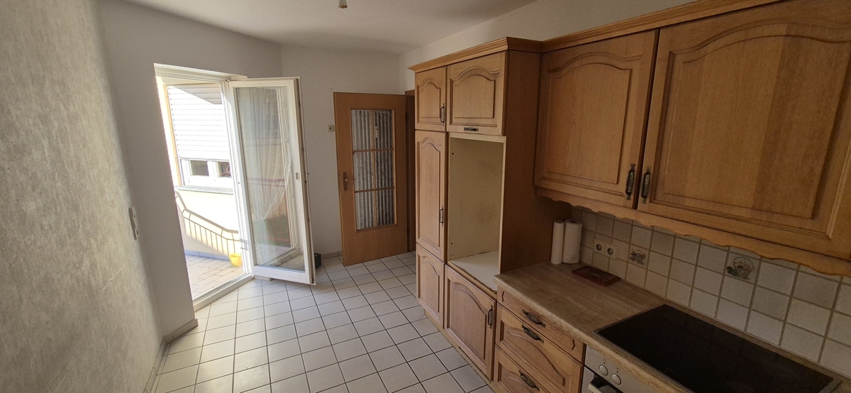 - Wohnküche mit Einbauschränken und Zugang zum kleinen Balkon
